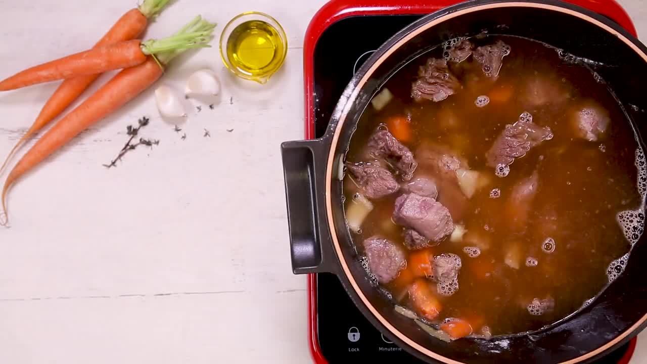 Un plat complet avec des légumes haricots verts pommes de terre carottes oignons tomates. Le boeuf en particulier la viande charolaise et le vin rouge pinot noir qui donne cette teinte pourpre à la sauce.
